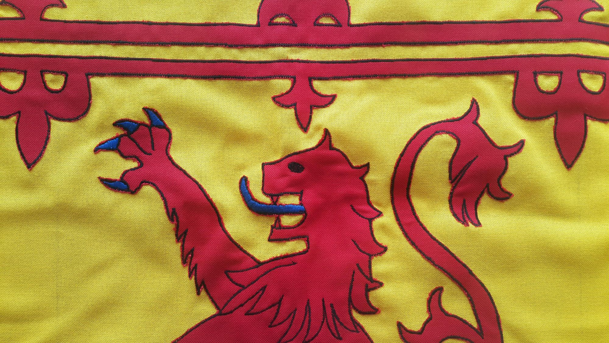 Red lion rampant hand embroidered on both sides of flag. Flag is sewn around multiple times using UK 'COATS' manufactured bonded nylon thread. The latter has superior abrasion resistance compared to generic cotton or core spun threads.