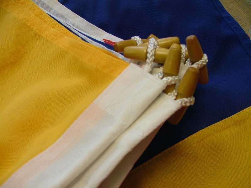 All signal flags are sewn using finest UK manufactured MoD approved woven polyester flag fabric (155 g/sqm). This is one of the most durable flag fabrics availbale on the market, specially designed for professional nautical use in extreme weahter conditions. The fabric has authentic natural look, which should not be confused with synthetic looking shiny nylon alternatives. The fully sewn design ensures the flags are perceived positively even if used on historical or luxury vessels. Our ICOS signal flags are triple sewn round the edges and fitted with special flag band/cord to guarantee long service.