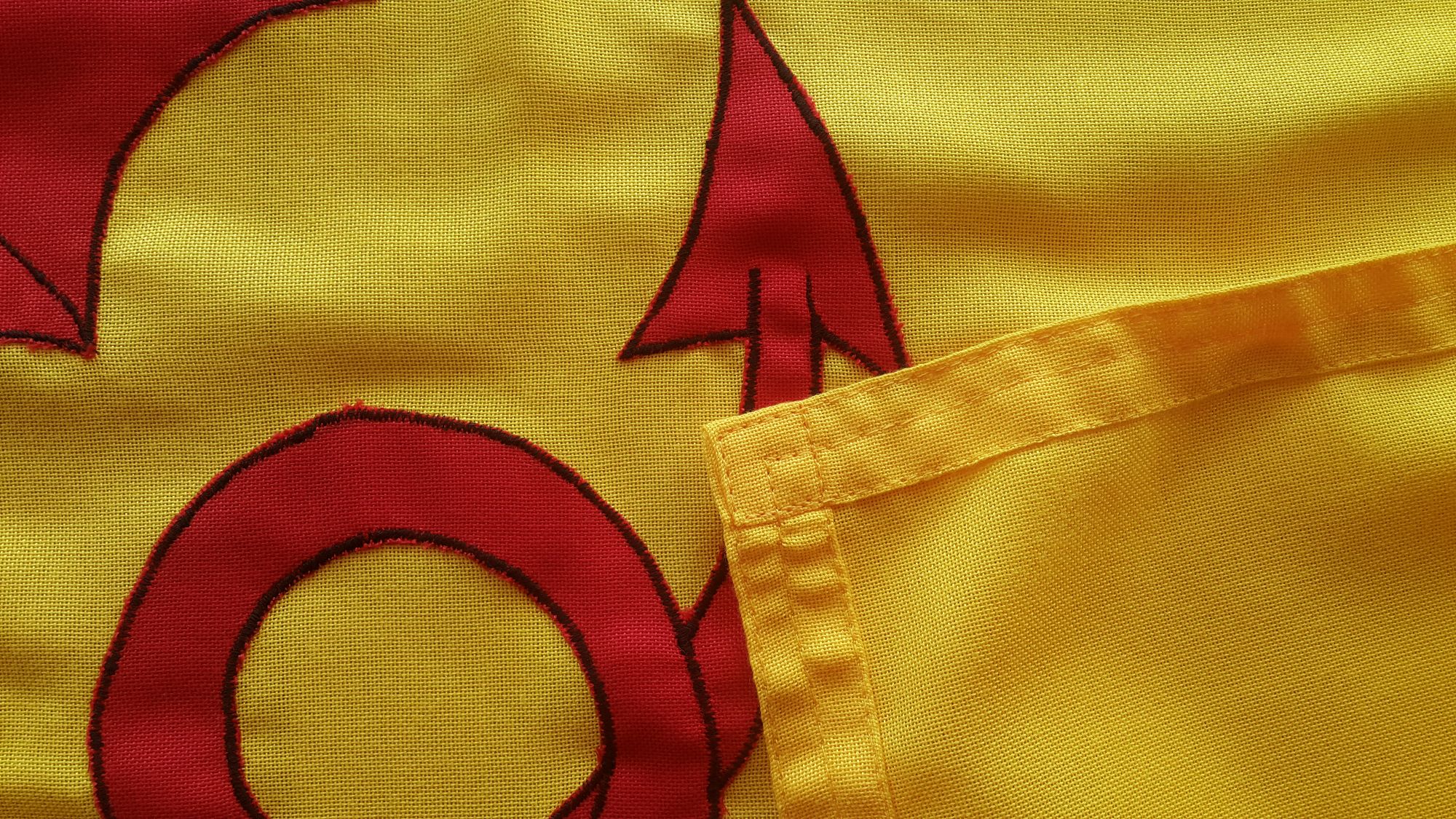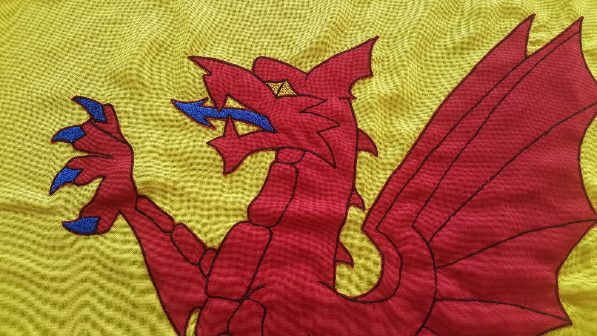 Red dragon rampant hand embroidered on both sides of flag. Flag is sewn around multiple times using UK 'COATS' manufactured bonded nylon thread. The latter has superior abrasion resistance compared to generic cotton or core spun threads.